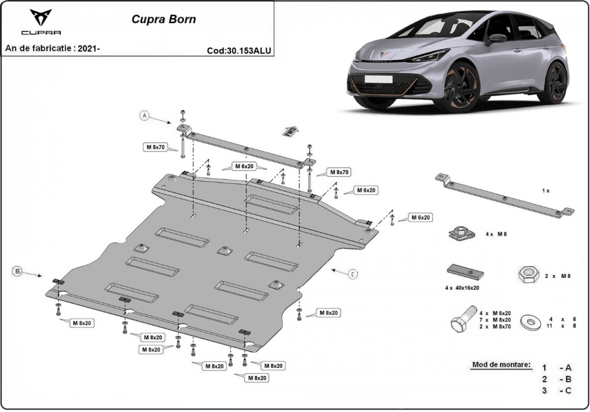 El cubre carter metalico es nuevo y se adapta perfectamente a todas las versiones de Cupra Born fabricadas entre 2021 y 2026. La placa protega los siguientes: motor, caja de cambios, radiador Está preparado de chapa de Aluminio de 3 mm. Los escudos son de aluminio, pero los soportes de fijación son de acero. Cerrojos, calces y todos los accesorios incluidos. Todas las placas son estrachadas con pintura de polvo anticorrosivo. Las placas del protección del motor son equipados con braceares soldados para resistir mejor a los impactos exteriores. |
