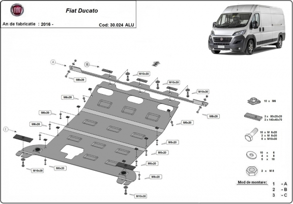 El cubre carter metalico es nuevo y se adapta perfectamente a todas las versiones de Fiat Ducato fabricadas entre 2016 y 2026. La placa protega los siguientes: motor, caja de cambios, radiador Está preparado de chapa de Aluminio de 4 mm. Los escudos son de aluminio, pero los soportes de fijación son de acero. Cerrojos, calces y todos los accesorios incluidos. Todas las placas son estrachadas con pintura de polvo anticorrosivo. Las placas del protección del motor son equipados con braceares soldados para resistir mejor a los impactos exteriores. |