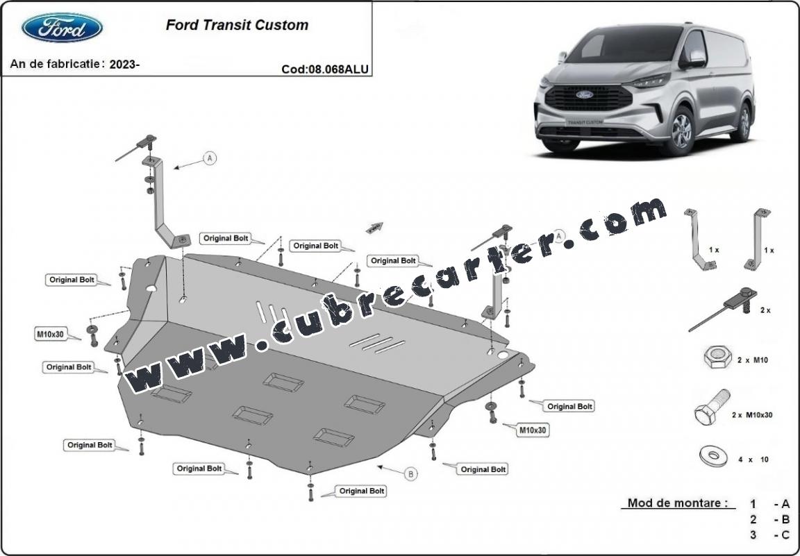 El cubre carter metalico es nuevo y se adapta perfectamente al Ford Transit Custom, con las siguientes versiones de motor / accionamiento: toate, fabricado entre 2023 y 2025. La placa protega los siguientes: motor, caja de cambios, radiador Está preparado de chapa de Aluminio de 3 mm. Los escudos son de aluminio, pero los soportes de fijación son de acero. Cerrojos, calces y todos los accesorios incluidos. Todas las placas son estrachadas con pintura de polvo anticorrosivo. Las placas del protección del motor son equipados con braceares soldados para resistir mejor a los impactos exteriores. |