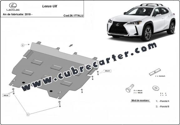El cubre carter metalico es nuevo y se adapta perfectamente al Lexus UX, con las siguientes versiones de motor / accionamiento: toate, fabricado entre 2019 y 2025. La placa protega los siguientes: motor, caja de cambios, radiador Está preparado de chapa de Aluminio de 3 mm. Los escudos son de aluminio, pero los soportes de fijación son de acero. Cerrojos, calces y todos los accesorios incluidos. Todas las placas son estrachadas con pintura de polvo anticorrosivo. Las placas del protección del motor son equipados con braceares soldados para resistir mejor a los impactos exteriores. |