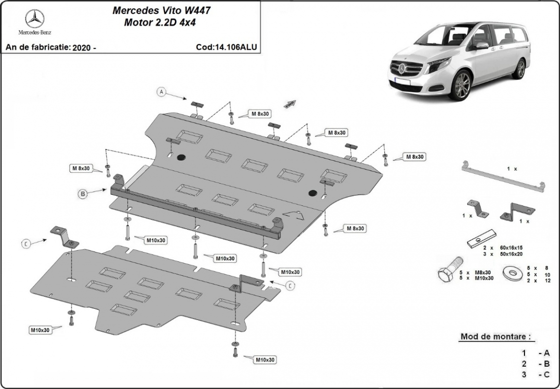 El cubre carter metalico es nuevo y se adapta perfectamente a todas las versiones de Mercedes Vito W447 fabricadas entre 2020 y 2026. La placa protega los siguientes: motor, caja de cambios, radiador Está preparado de chapa de Aluminio de 3 mm. Los escudos son de aluminio, pero los soportes de fijación son de acero. Cerrojos, calces y todos los accesorios incluidos. Todas las placas son estrachadas con pintura de polvo anticorrosivo. Las placas del protección del motor son equipados con braceares soldados para resistir mejor a los impactos exteriores. |