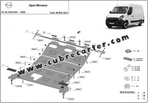 El cubre carter metalico es nuevo y se adapta perfectamente al Opel Movano, con las siguientes versiones de motor / accionamiento: toate, fabricado entre 2022 y 2025. La placa protega los siguientes: motor, caja de cambios, radiador Está preparado de chapa de Aluminio de 4 mm. Los escudos son de aluminio, pero los soportes de fijación son de acero. Cerrojos, calces y todos los accesorios incluidos. Todas las placas son estrachadas con pintura de polvo anticorrosivo. Las placas del protección del motor son equipados con braceares soldados para resistir mejor a los impactos exteriores. |