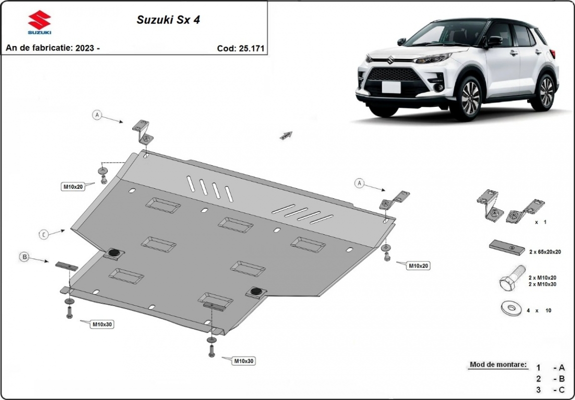 El cubre carter metalico es nuevo y se adapta perfectamente al Suzuki SX4, con las siguientes versiones de motor / accionamiento: Hybrid, fabricado entre 2023 y 2026. La placa protega los siguientes: motor, caja de cambios Está preparado de chapa de Aluminio de 4 mm. Los escudos son de aluminio, pero los soportes de fijación son de acero. Cerrojos, calces y todos los accesorios incluidos. Todas las placas son estrachadas con pintura de polvo anticorrosivo. Las placas del protección del motor son equipados con braceares soldados para resistir mejor a los impactos exteriores. |