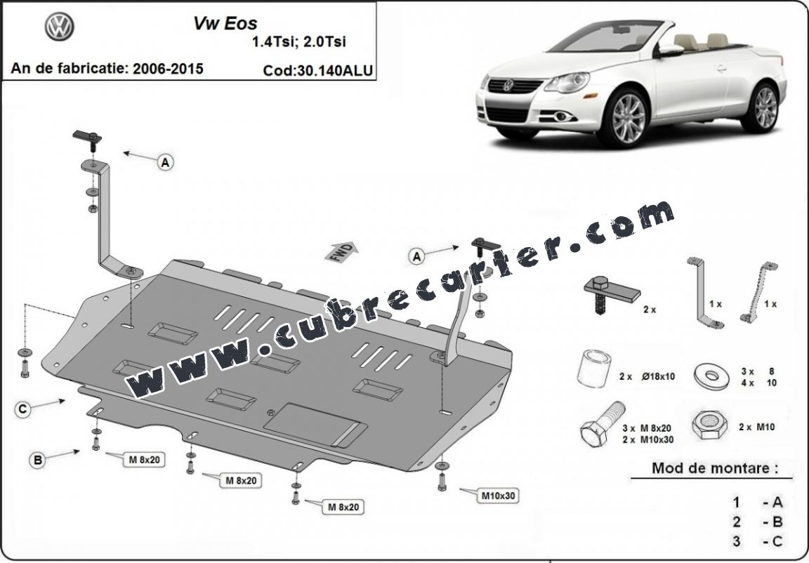 El cubre carter metalico es nuevo y se adapta perfectamente al Volkswagen Eos, con las siguientes versiones de motor / accionamiento: 1.4Tsi, 2.0Tsi, fabricado entre 2006 y 2015.