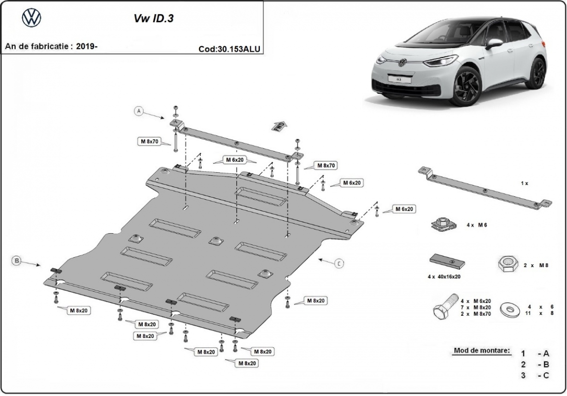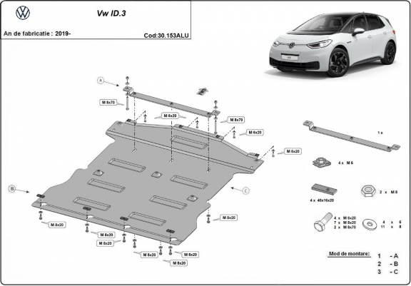 El cubre carter metalico es nuevo y se adapta perfectamente a todas las versiones de Volkswagen ID.3 fabricadas entre 2019 y 2026. La placa protega los siguientes: motor, caja de cambios, radiador Está preparado de chapa de Aluminio de 3 mm. Los escudos son de aluminio, pero los soportes de fijación son de acero. Cerrojos, calces y todos los accesorios incluidos. Todas las placas son estrachadas con pintura de polvo anticorrosivo. Las placas del protección del motor son equipados con braceares soldados para resistir mejor a los impactos exteriores. |