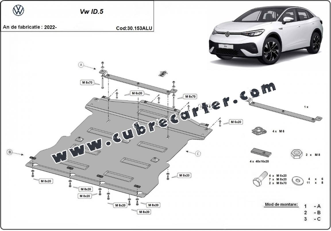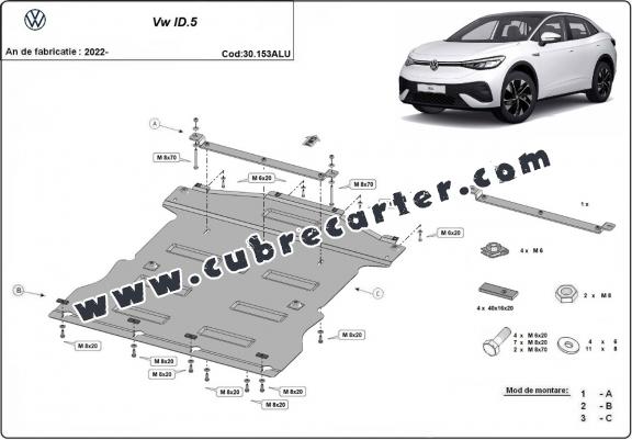 El cubre carter metalico es nuevo y se adapta perfectamente al Volkswagen ID.5, con las siguientes versiones de motor / accionamiento: toate, fabricado entre 2022 y 2025.