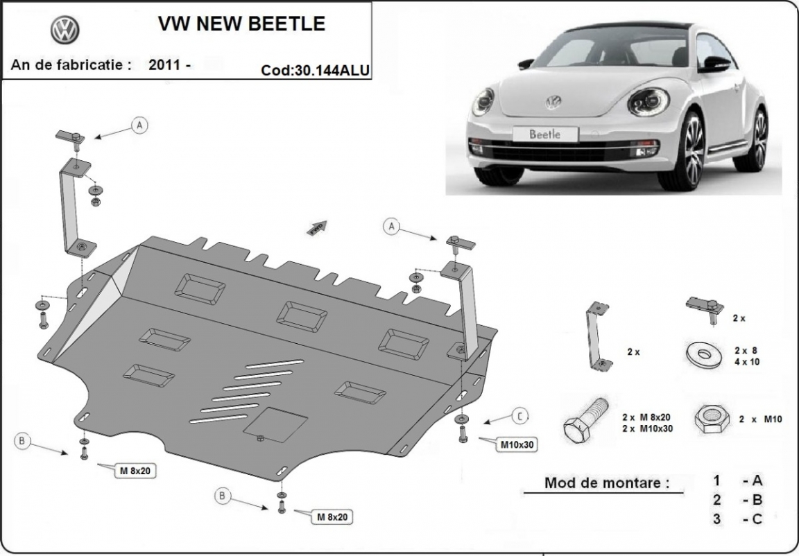 El cubre carter metalico es nuevo y se adapta perfectamente a todas las versiones de Volkswagen New Beetle fabricadas entre 2011 y 2017. La placa protega los siguientes: motor, caja de cambios, radiador Está preparado de chapa de Aluminio de 3 mm. Los escudos son de aluminio, pero los soportes de fijación son de acero. Cerrojos, calces y todos los accesorios incluidos. Todas las placas son estrachadas con pintura de polvo anticorrosivo. Las placas del protección del motor son equipados con braceares soldados para resistir mejor a los impactos exteriores. |
