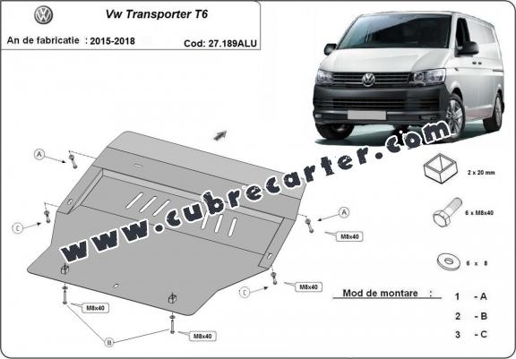 El cubre carter metalico es nuevo y se adapta perfectamente al Volkswagen Transporter T6, con las siguientes versiones de motor / accionamiento: toate, fabricado entre 2015 y 2019. La placa protega los siguientes: motor, caja de cambios, radiador, parachoques delantero Está preparado de chapa de Aluminio de 4 mm. Los escudos son de aluminio, pero los soportes de fijación son de acero. Cerrojos, calces y todos los accesorios incluidos. Todas las placas son estrachadas con pintura de polvo anticorrosivo. Las placas del protección del motor son equipados con braceares soldados para resistir mejor a los impactos exteriores. |