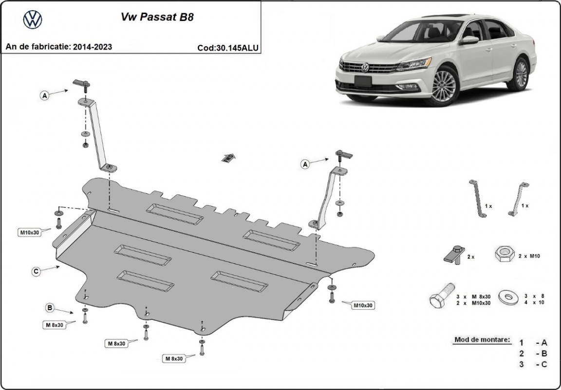 El cubre carter metalico es nuevo y se adapta perfectamente a todas las versiones de VW Passat B8 fabricadas entre 2014 y 2023. La placa protega los siguientes: motor, caja de cambios, radiador, parachoques delantero Está preparado de chapa de Aluminio de 3 mm. Los escudos son de aluminio, pero los soportes de fijación son de acero. Cerrojos, calces y todos los accesorios incluidos. Todas las placas son estrachadas con pintura de polvo anticorrosivo. Las placas del protección del motor son equipados con braceares soldados para resistir mejor a los impactos exteriores. |