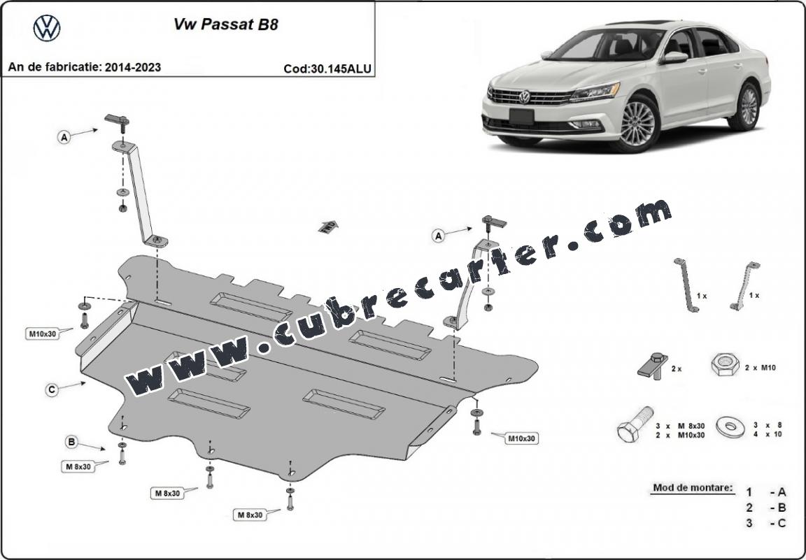 El cubre carter metalico es nuevo y se adapta perfectamente al VW Passat B8, con las siguientes versiones de motor / accionamiento: toate, fabricado entre 2014 y 2023. La placa protega los siguientes: motor, caja de cambios, radiador, parachoques delantero Está preparado de chapa de Aluminio de 3 mm. Los escudos son de aluminio, pero los soportes de fijación son de acero. Cerrojos, calces y todos los accesorios incluidos. Todas las placas son estrachadas con pintura de polvo anticorrosivo. Las placas del protección del motor son equipados con braceares soldados para resistir mejor a los impactos exteriores. |