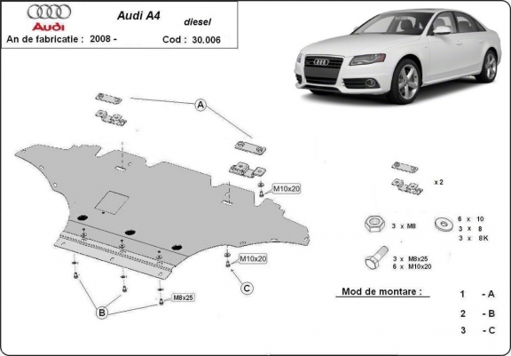 El cubre carter metalico es nuevo y se adapta perfectamente al Audi A4 B8 All Road, con las siguientes versiones de motor / accionamiento: 2.0TFSI,2.0Tdi, quatro, 2.7TDI , fabricado entre 2008 y 2014. La placa protega los siguientes: motor, radiador, parachoques delantero Está preparado de chapa de Acero de 2 mm. Cerrojos, calces y todos los accesorios incluidos. Todas las placas son estrachadas con pintura de polvo anticorrosivo. Las placas del protección del motor son equipados con braceares soldados para resistir mejor a los impactos exteriores. |