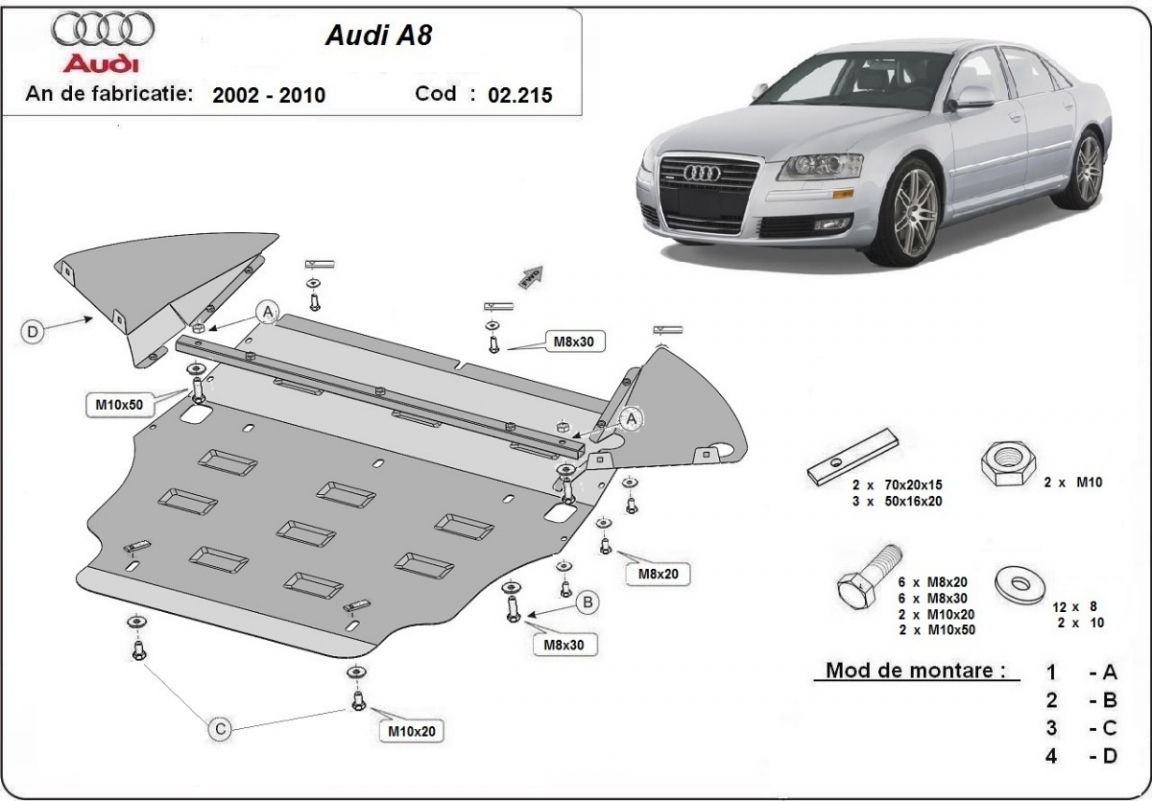 El cubre carter metalico es nuevo y se adapta perfectamente a todas las versiones de Audi A8 fabricadas entre 2002 y 2010. La placa protega los siguientes: motor, caja de cambios, radiador, parachoques delantero Está preparado de chapa de Acero de 2 mm. Cerrojos, calces y todos los accesorios incluidos. Todas las placas son estrachadas con pintura de polvo anticorrosivo. Las placas del protección del motor son equipados con braceares soldados para resistir mejor a los impactos exteriores. |