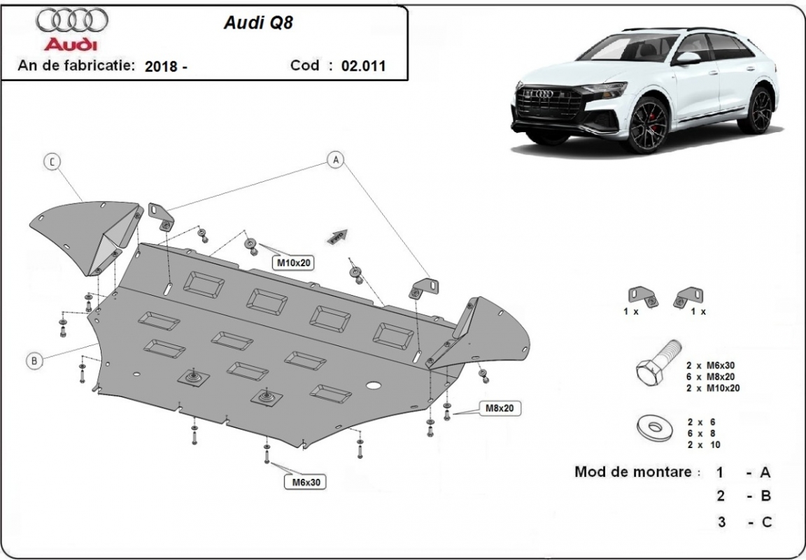 El cubre carter metalico es nuevo y se adapta perfectamente a todas las versiones de Audi Q8 fabricadas entre 2018 y 2020. La placa protega los siguientes: motor, radiador, parachoques delantero Está preparado de chapa de Acero de 2 mm. Cerrojos, calces y todos los accesorios incluidos. Todas las placas son estrachadas con pintura de polvo anticorrosivo. Las placas del protección del motor son equipados con braceares soldados para resistir mejor a los impactos exteriores. |