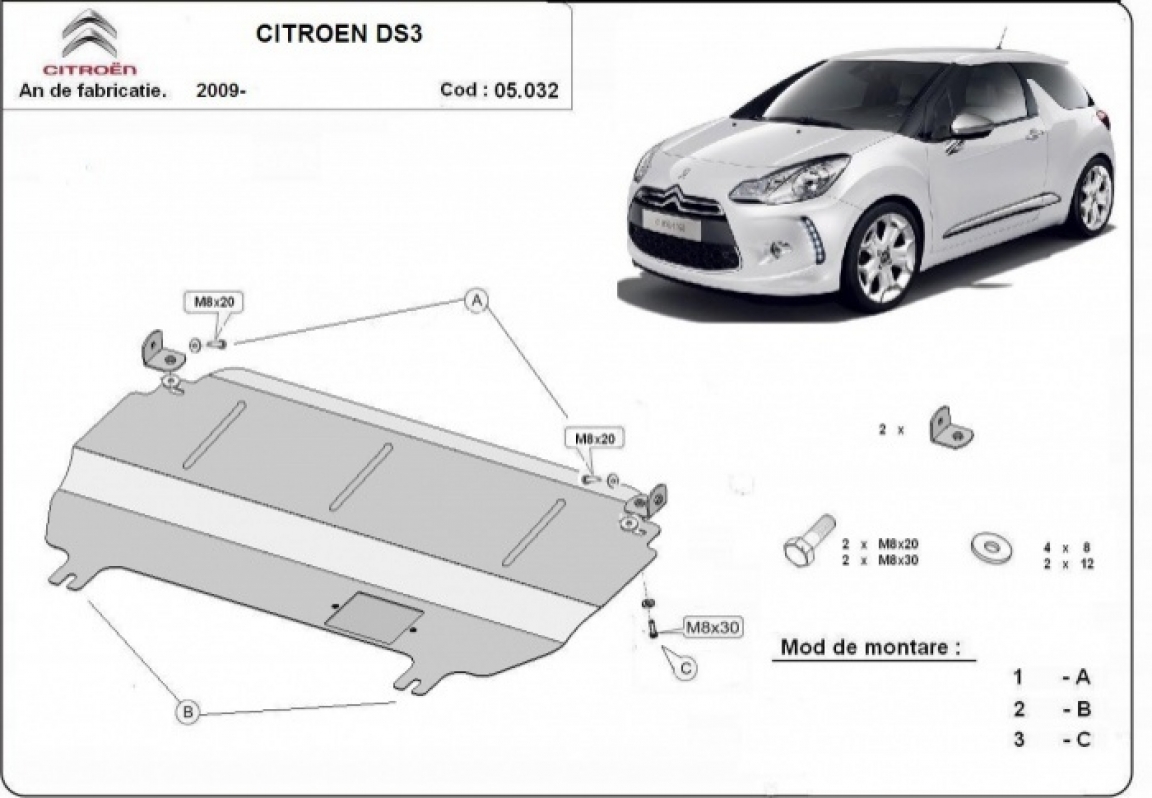 El cubre carter metalico es nuevo y se adapta perfectamente al Citroen DS3, con las siguientes versiones de motor / accionamiento: 1.1,1.2, 1.4, 1.6, 1.6 HDI, fabricado entre 2009 y 2026. La placa protega los siguientes: motor, caja de cambios Montada con salida de petróleo descendido así que no es necesario el cambio del petróleo cuando se quita la placa. Está preparado de chapa de Acero de 2 mm. Cerrojos, calces y todos los accesorios incluidos. Todas las placas son estrachadas con pintura de polvo anticorrosivo. Las placas del protección del motor son equipados con braceares soldados para resistir mejor a los impactos exteriores. |