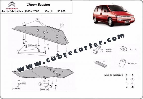 El cubre carter metalico es nuevo y se adapta perfectamente al Citroen Evaeton, con las siguientes versiones de motor / accionamiento: toate, fabricado entre 1995 y 2003. La placa protega los siguientes: motor, caja de cambios, radiador, parachoques delantero Está preparado de chapa de Acero de 2 mm. Cerrojos, calces y todos los accesorios incluidos. Todas las placas son estrachadas con pintura de polvo anticorrosivo. Las placas del protección del motor son equipados con braceares soldados para resistir mejor a los impactos exteriores. |