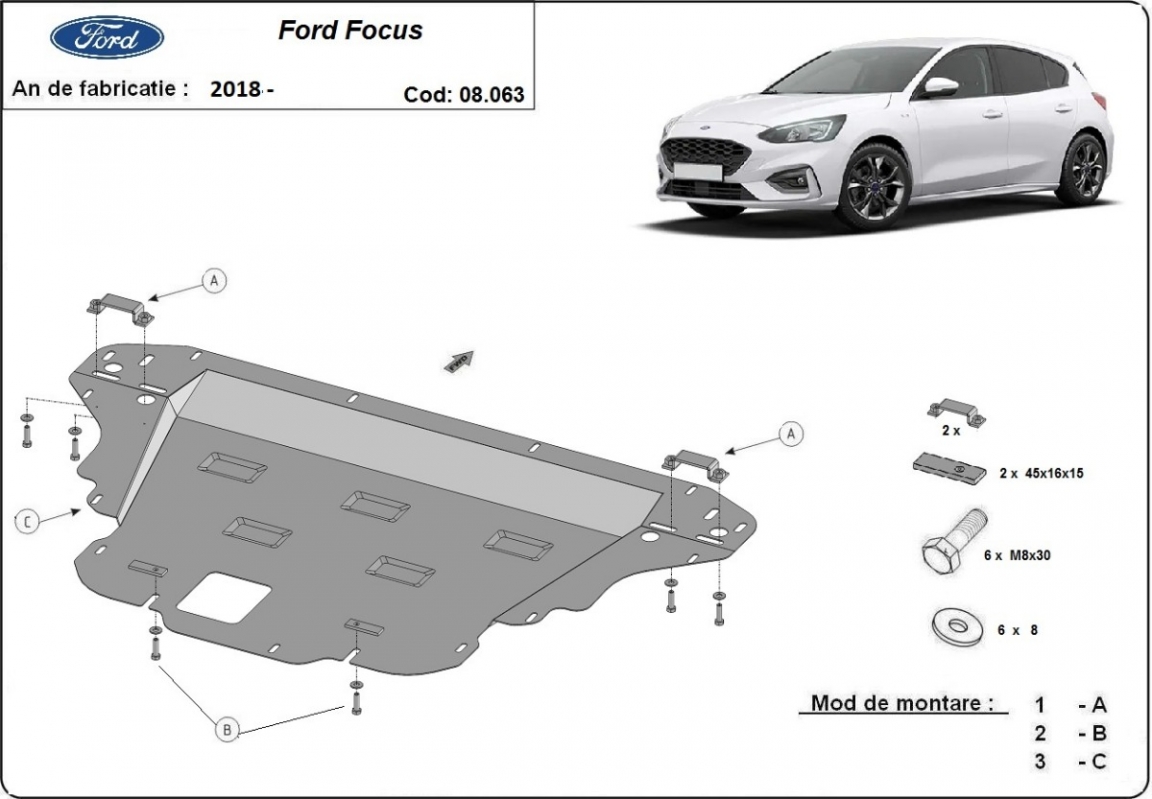 El cubre carter metalico es nuevo y se adapta perfectamente a todas las versiones de Ford Focus 4 fabricadas entre 2018 y 2026. La placa protega los siguientes: motor, caja de cambios, radiador, parachoques delantero Está preparado de chapa de Acero de 2 mm. Cerrojos, calces y todos los accesorios incluidos. Todas las placas son estrachadas con pintura de polvo anticorrosivo. Las placas del protección del motor son equipados con braceares soldados para resistir mejor a los impactos exteriores. |
