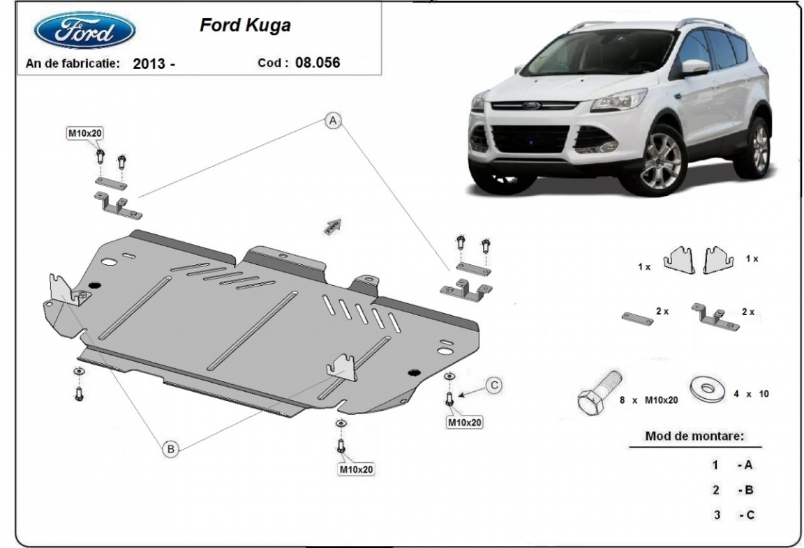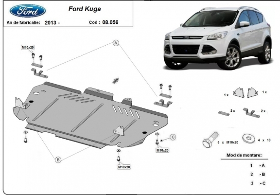 El cubre carter metalico es nuevo y se adapta perfectamente a todas las versiones de Ford Kuga fabricadas entre 2013 y 2019. La placa protega los siguientes: motor, caja de cambios Está preparado de chapa de Acero de 2 mm. Cerrojos, calces y todos los accesorios incluidos. Todas las placas son estrachadas con pintura de polvo anticorrosivo. Las placas del protección del motor son equipados con braceares soldados para resistir mejor a los impactos exteriores. |