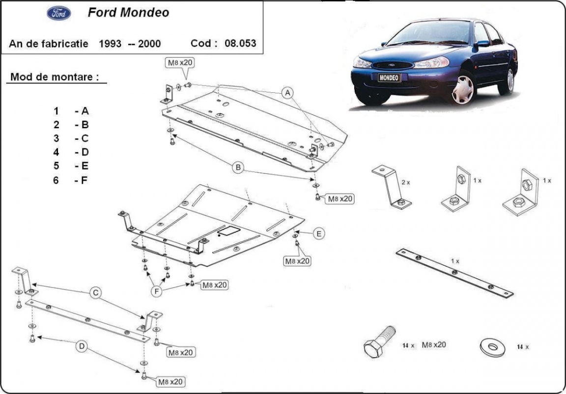 El cubre carter metalico es nuevo y se adapta perfectamente al Ford Mondeo 1,2, con las siguientes versiones de motor / accionamiento: 1.8 , 2.0, fabricado entre 1992 y 2000. La placa protega los siguientes: motor, caja de cambios, radiador, parachoques delantero Montada con salida de petróleo descendido así que no es necesario el cambio del petróleo cuando se quita la placa. Está preparado de chapa de Acero de 2 mm. Cerrojos, calces y todos los accesorios incluidos. Todas las placas son estrachadas con pintura de polvo anticorrosivo. Las placas del protección del motor son equipados con braceares soldados para resistir mejor a los impactos exteriores. |