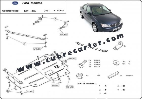 El cubre carter metalico es nuevo y se adapta perfectamente al Ford Mondeo, con las siguientes versiones de motor / accionamiento: toate, fabricado entre 2000 y 2006. La placa protega los siguientes: motor, caja de cambios, radiador Montada con salida de petróleo descendido así que no es necesario el cambio del petróleo cuando se quita la placa. Está preparado de chapa de Acero de 2 mm. Cerrojos, calces y todos los accesorios incluidos. Todas las placas son estrachadas con pintura de polvo anticorrosivo. Las placas del protección del motor son equipados con braceares soldados para resistir mejor a los impactos exteriores. |