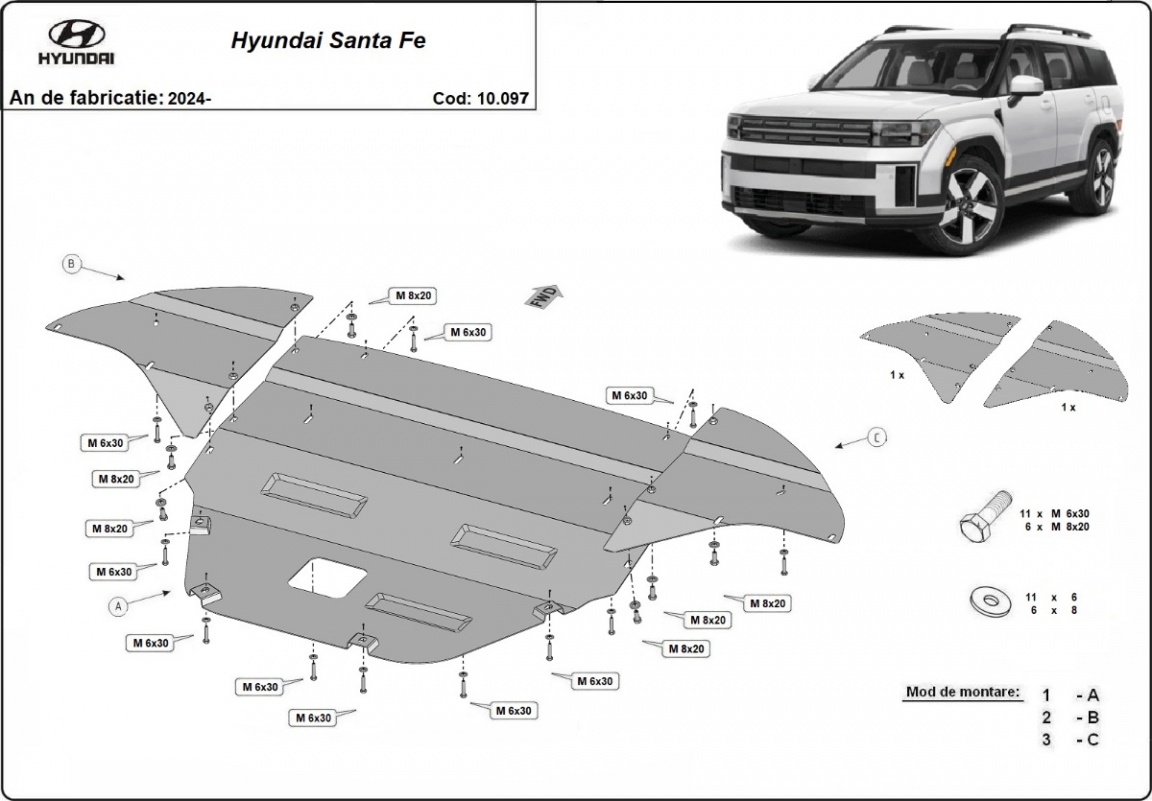 El cubre carter metalico es nuevo y se adapta perfectamente a todas las versiones de Hyundai Santa Fe fabricadas entre 2024 y 2026. La placa protega los siguientes: motor, caja de cambios, radiador, parachoques delantero Está preparado de chapa de Acero de 2 mm. Cerrojos, calces y todos los accesorios incluidos. Todas las placas son estrachadas con pintura de polvo anticorrosivo. Las placas del protección del motor son equipados con braceares soldados para resistir mejor a los impactos exteriores. |