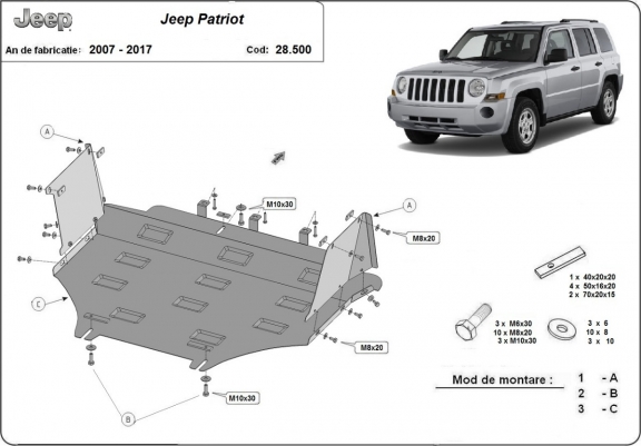 El cubre carter metalico es nuevo y se adapta perfectamente a todas las versiones de Jeep Patriot fabricadas entre 2007 y 2017. La placa protega los siguientes: motor, radiador, parachoques delantero Está preparado de chapa de Acero de 2 mm. Cerrojos, calces y todos los accesorios incluidos. Todas las placas son estrachadas con pintura de polvo anticorrosivo. Las placas del protección del motor son equipados con braceares soldados para resistir mejor a los impactos exteriores. |