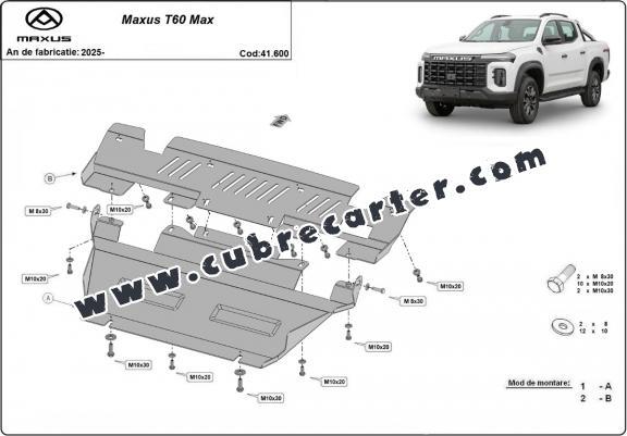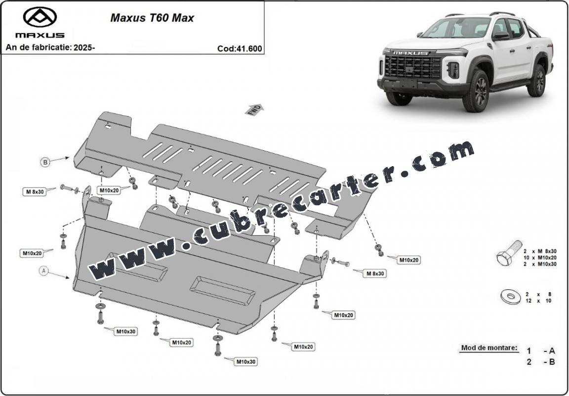 El cubre carter metalico es nuevo y se adapta perfectamente al Maxus T60 Max, con las siguientes versiones de motor / accionamiento: toate, fabricado entre 2025 y 2025. La placa protega los siguientes: motor, radiador Está preparado de chapa de Acero de 3 mm. Cerrojos, calces y todos los accesorios incluidos. Todas las placas son estrachadas con pintura de polvo anticorrosivo. Las placas del protección del motor son equipados con braceares soldados para resistir mejor a los impactos exteriores. |