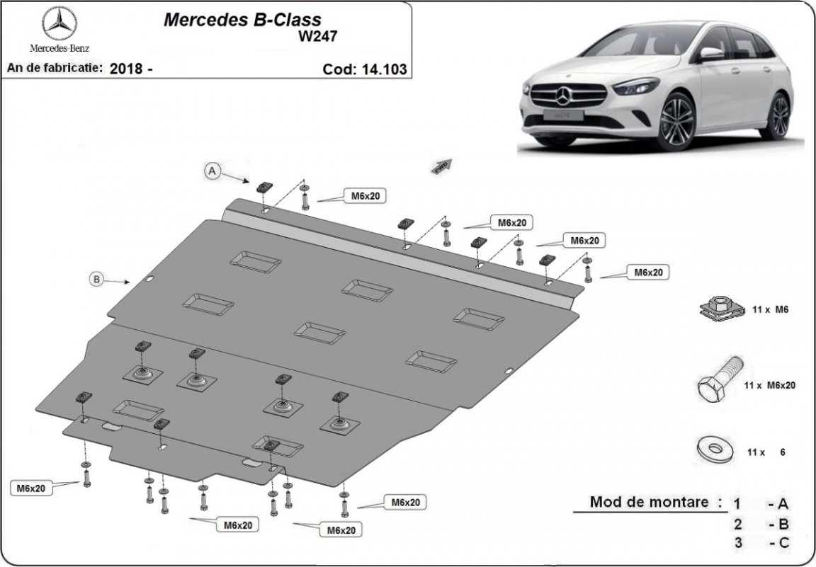 El cubre carter metalico es nuevo y se adapta perfectamente a todas las versiones de Mercedes B-Class W247 fabricadas entre 2019 y 2026. La placa protega los siguientes: motor, caja de cambios, radiador Está preparado de chapa de Acero de 2 mm. Cerrojos, calces y todos los accesorios incluidos. Todas las placas son estrachadas con pintura de polvo anticorrosivo. Las placas del protección del motor son equipados con braceares soldados para resistir mejor a los impactos exteriores. |