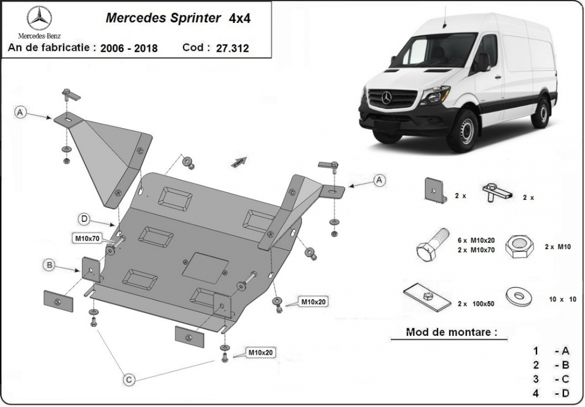 El cubre carter metalico es nuevo y se adapta perfectamente al Mercedes Sprinter 4x4, con las siguientes versiones de motor / accionamiento: 4x4, fabricado entre 2006 y 2018. La placa protega los siguientes: motor Montada con salida de petróleo descendido así que no es necesario el cambio del petróleo cuando se quita la placa. Está preparado de chapa de Acero de 2.5 mm. Cerrojos, calces y todos los accesorios incluidos. Todas las placas son estrachadas con pintura de polvo anticorrosivo. Las placas del protección del motor son equipados con braceares soldados para resistir mejor a los impactos exteriores. |
