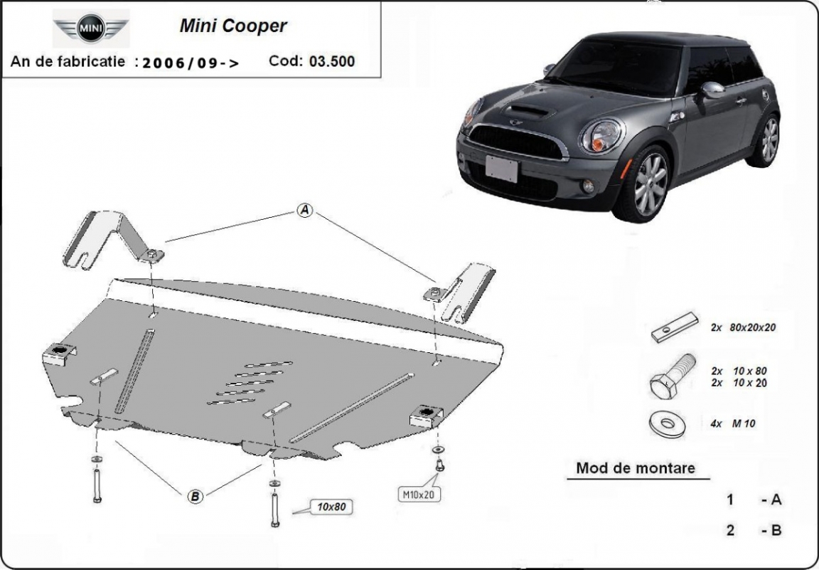 El cubre carter metalico es nuevo y se adapta perfectamente a todas las versiones de Mini Cooper R56 fabricadas entre 2006 y 2014. La placa protega los siguientes: motor, caja de cambios Está preparado de chapa de Acero de 2 mm. Cerrojos, calces y todos los accesorios incluidos. Todas las placas son estrachadas con pintura de polvo anticorrosivo. Las placas del protección del motor son equipados con braceares soldados para resistir mejor a los impactos exteriores. |