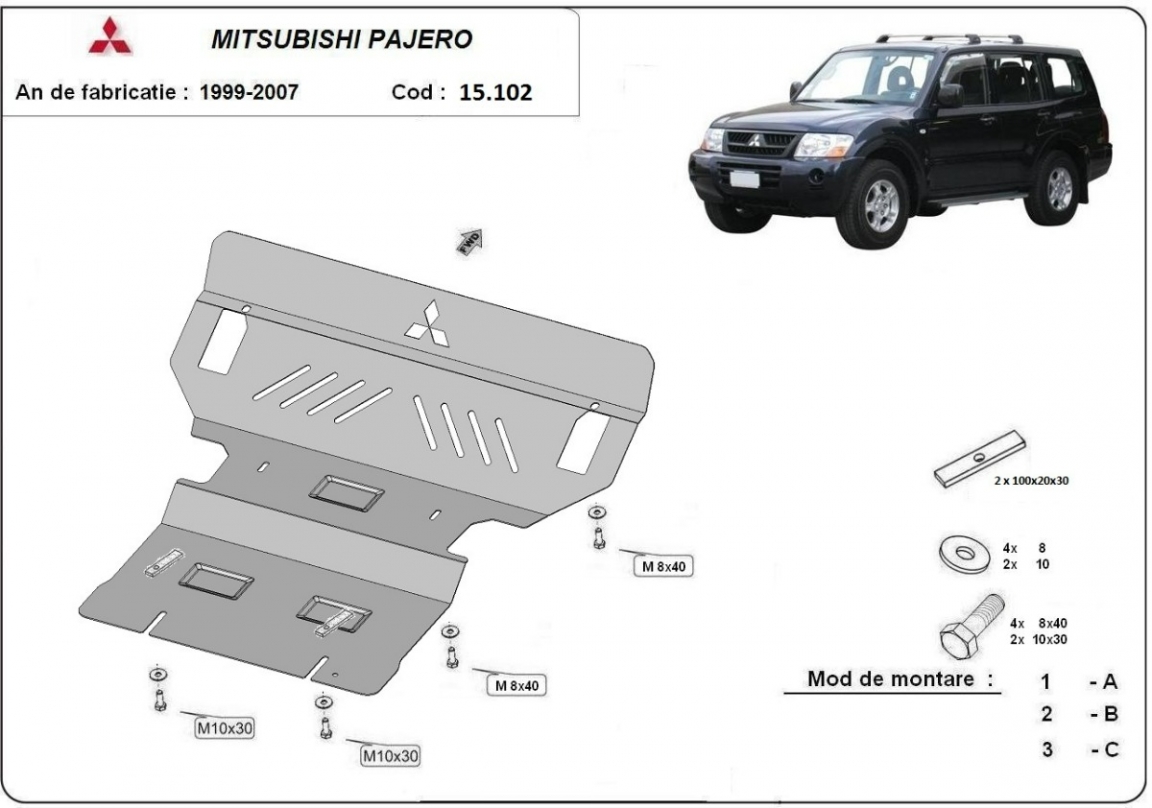 El cubre carter metalico es nuevo y se adapta perfectamente al Mitsubishi Montero 3 (V60, V70), con las siguientes versiones de motor / accionamiento: 3.5 Gdi; 2.5 Tdi; 3.2 Di-d, fabricado entre 1999 y 2007. La placa protega los siguientes: motor, radiador Está preparado de chapa de Acero de 2,5 mm. Cerrojos, calces y todos los accesorios incluidos. Todas las placas son estrachadas con pintura de polvo anticorrosivo. Las placas del protección del motor son equipados con braceares soldados para resistir mejor a los impactos exteriores. |