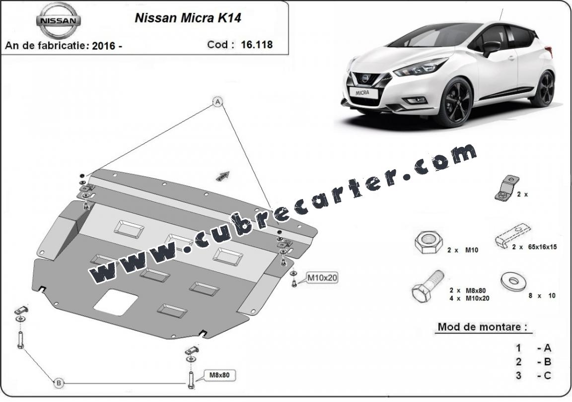 El cubre carter metalico es nuevo y se adapta perfectamente al Nissan Micra, con las siguientes versiones de motor / accionamiento: toate, fabricado entre 2016 y 2025.