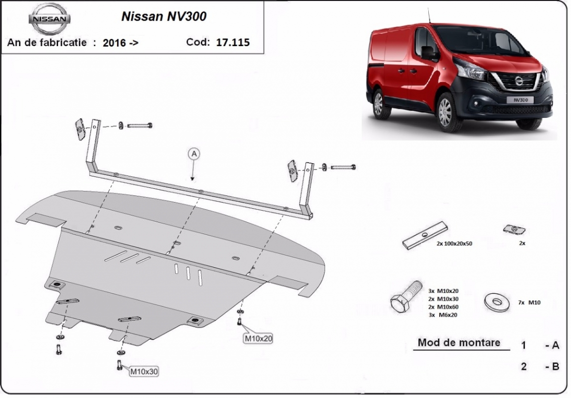 El cubre carter metalico es nuevo y se adapta perfectamente a todas las versiones de Nissan NV300 fabricadas entre 2014 y 2021. La placa protega los siguientes: motor, caja de cambios, radiador, parachoques delantero Está preparado de chapa de Acero de 2 mm. Cerrojos, calces y todos los accesorios incluidos. Todas las placas son estrachadas con pintura de polvo anticorrosivo. Las placas del protección del motor son equipados con braceares soldados para resistir mejor a los impactos exteriores. |