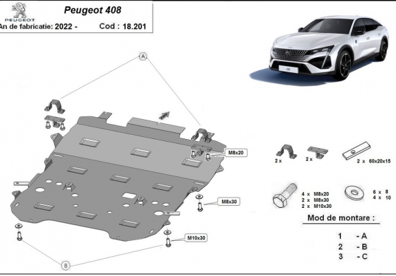 El cubre carter metalico es nuevo y se adapta perfectamente a todas las versiones de Peugeot 408 fabricadas entre 2022 y 2026. La placa protega los siguientes: motor, caja de cambios, radiador, parachoques delantero Está preparado de chapa de Acero de 2 mm. Cerrojos, calces y todos los accesorios incluidos. Todas las placas son estrachadas con pintura de polvo anticorrosivo. Las placas del protección del motor son equipados con braceares soldados para resistir mejor a los impactos exteriores. |