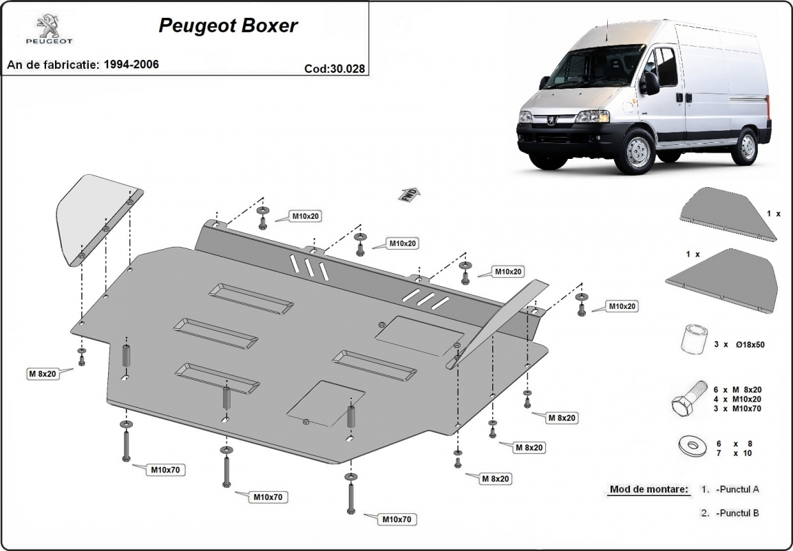 El cubre carter metalico es nuevo y se adapta perfectamente a todas las versiones de Peugeot Boxer fabricadas entre 1996 y 2006. La placa protega los siguientes: motor, caja de cambios, radiador Montada con salida de petróleo descendido así que no es necesario el cambio del petróleo cuando se quita la placa. Está preparado de chapa de Acero de 2 mm. Cerrojos, calces y todos los accesorios incluidos. Todas las placas son estrachadas con pintura de polvo anticorrosivo. Las placas del protección del motor son equipados con braceares soldados para resistir mejor a los impactos exteriores. |