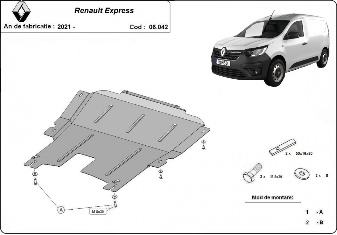 El cubre carter metalico es nuevo y se adapta perfectamente a todas las versiones de Renault Express fabricadas entre 2021 y 2026. La placa protega los siguientes: motor, caja de cambios Está preparado de chapa de Acero de 2 mm. Cerrojos, calces y todos los accesorios incluidos. Todas las placas son estrachadas con pintura de polvo anticorrosivo. Las placas del protección del motor son equipados con braceares soldados para resistir mejor a los impactos exteriores. |