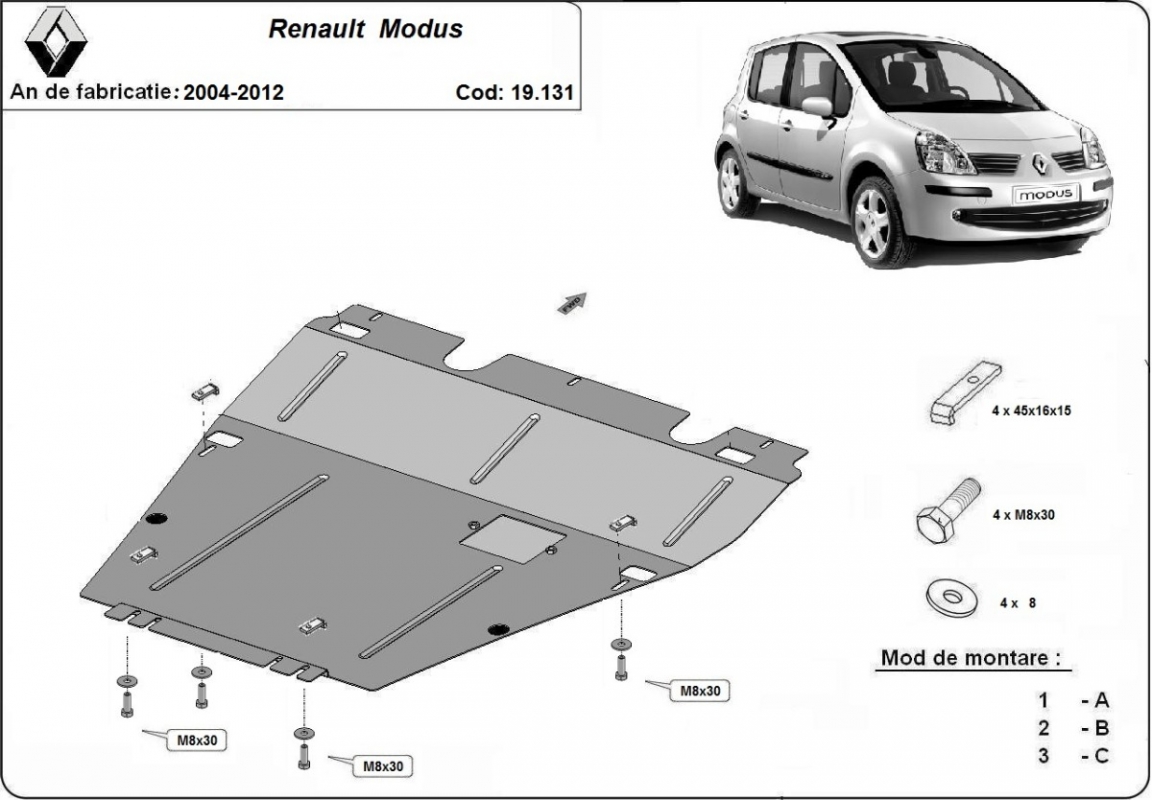 El cubre carter metalico es nuevo y se adapta perfectamente a todas las versiones de Renault Modus fabricadas entre 2004 y 2012. La placa protega los siguientes: motor, caja de cambios Está preparado de chapa de Acero de 2 mm. Cerrojos, calces y todos los accesorios incluidos. Todas las placas son estrachadas con pintura de polvo anticorrosivo. Las placas del protección del motor son equipados con braceares soldados para resistir mejor a los impactos exteriores. |