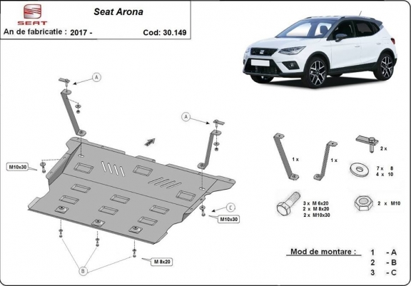 El cubre carter metalico es nuevo y se adapta perfectamente a todas las versiones de Seat Arona fabricadas entre 2017 y 2026. La placa protega los siguientes: motor, caja de cambios, radiador, parachoques delantero, DPF , filtro de partículas Está preparado de chapa de Acero de 2 mm. Cerrojos, calces y todos los accesorios incluidos. Todas las placas son estrachadas con pintura de polvo anticorrosivo. Las placas del protección del motor son equipados con braceares soldados para resistir mejor a los impactos exteriores. |
