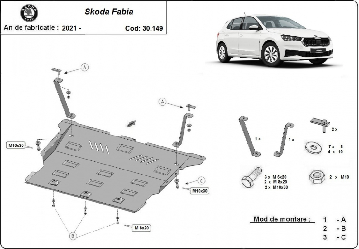El cubre carter metalico es nuevo y se adapta perfectamente a todas las versiones de Skoda Fabia fabricadas entre 2021 y 2026. La placa protega los siguientes: motor, caja de cambios, radiador, parachoques delantero Está preparado de chapa de Acero de 2 mm. Cerrojos, calces y todos los accesorios incluidos. Todas las placas son estrachadas con pintura de polvo anticorrosivo. Las placas del protección del motor son equipados con braceares soldados para resistir mejor a los impactos exteriores. |