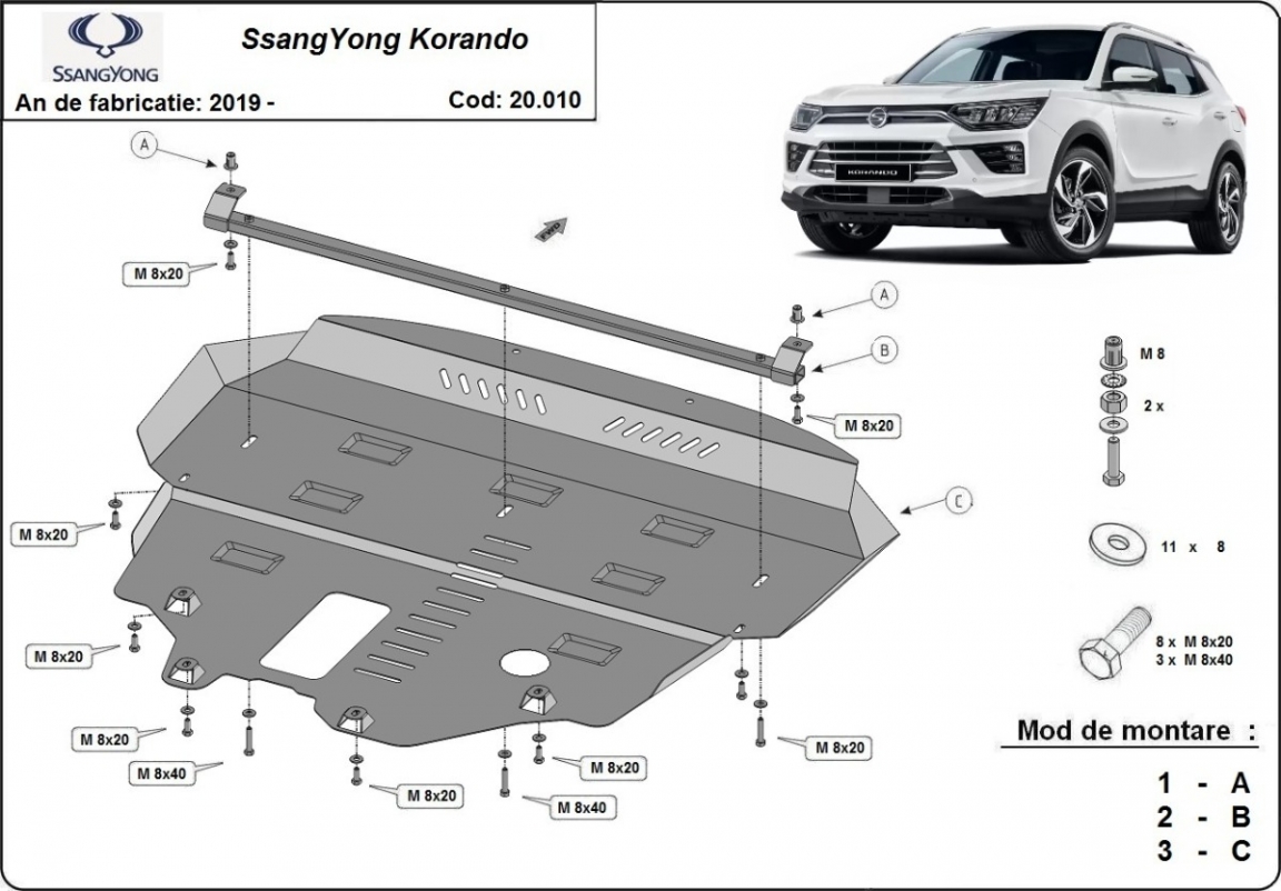 El cubre carter metalico es nuevo y se adapta perfectamente a todas las versiones de SsangYong Korando fabricadas entre 2019 y 2026. La placa protega los siguientes: motor, caja de cambios, radiador Está preparado de chapa de Acero de 2 mm. Cerrojos, calces y todos los accesorios incluidos. Todas las placas son estrachadas con pintura de polvo anticorrosivo. Las placas del protección del motor son equipados con braceares soldados para resistir mejor a los impactos exteriores. |