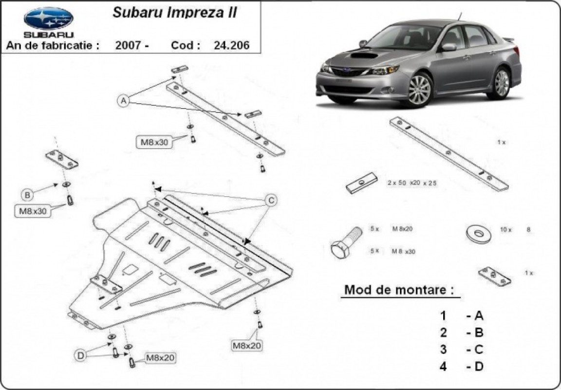 El cubre carter metalico es nuevo y se adapta perfectamente al Subaru Impreza, con las siguientes versiones de motor / accionamiento: essence, fabricado entre 2007 y 2016. La placa protega los siguientes: motor, caja de cambios Está preparado de chapa de Acero de 2 mm. Cerrojos, calces y todos los accesorios incluidos. Todas las placas son estrachadas con pintura de polvo anticorrosivo. Las placas del protección del motor son equipados con braceares soldados para resistir mejor a los impactos exteriores. |