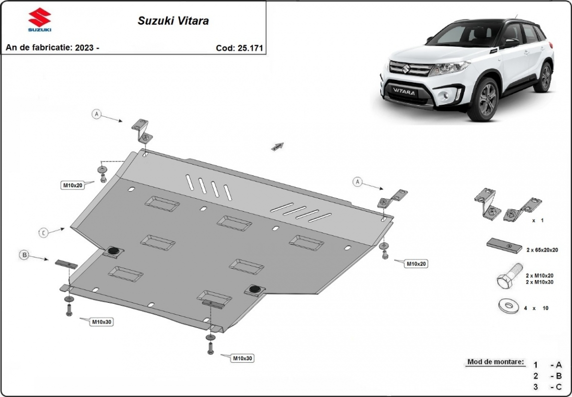 El cubre carter metalico es nuevo y se adapta perfectamente al Suzuki Vitara, con las siguientes versiones de motor / accionamiento: Hybrid, fabricado entre 2023 y 2026. La placa protega los siguientes: motor, caja de cambios Está preparado de chapa de Acero de 2 mm. Cerrojos, calces y todos los accesorios incluidos. Todas las placas son estrachadas con pintura de polvo anticorrosivo. Las placas del protección del motor son equipados con braceares soldados para resistir mejor a los impactos exteriores. |