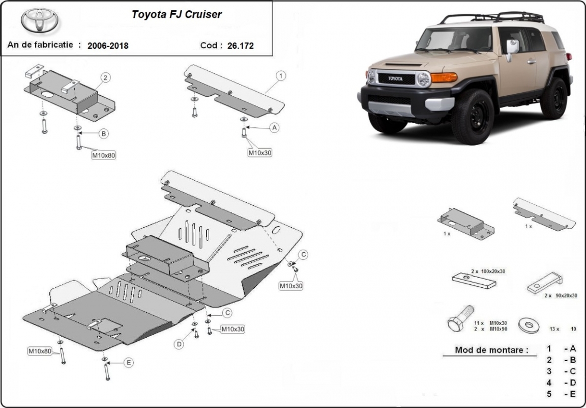 El cubre carter metalico es nuevo y se adapta perfectamente a todas las versiones de Toyota Fj Cruiser fabricadas entre 2006 y 2018. La placa protega los siguientes: motor, radiador, parachoques delantero Está preparado de chapa de Acero de 2.5 mm. Cerrojos, calces y todos los accesorios incluidos. Todas las placas son estrachadas con pintura de polvo anticorrosivo. Las placas del protección del motor son equipados con braceares soldados para resistir mejor a los impactos exteriores. |