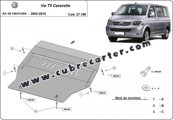 El cubre carter metalico es nuevo y se adapta perfectamente al Volkswagen Caravelle T5, con las siguientes versiones de motor / accionamiento: , fabricado entre 2005 y 2017. La placa protega los siguientes: motor, caja de cambios, radiador, parachoques delantero Está preparado de chapa de Acero de 2 mm. Cerrojos, calces y todos los accesorios incluidos. Todas las placas son estrachadas con pintura de polvo anticorrosivo. Las placas del protección del motor son equipados con braceares soldados para resistir mejor a los impactos exteriores. |