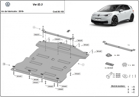 El cubre carter metalico es nuevo y se adapta perfectamente a todas las versiones de Volkswagen ID 3 fabricadas entre 2019 y 2026. La placa protega los siguientes: motor, caja de cambios, radiador Está preparado de chapa de Acero de 2 mm. Cerrojos, calces y todos los accesorios incluidos. Todas las placas son estrachadas con pintura de polvo anticorrosivo. Las placas del protección del motor son equipados con braceares soldados para resistir mejor a los impactos exteriores. |