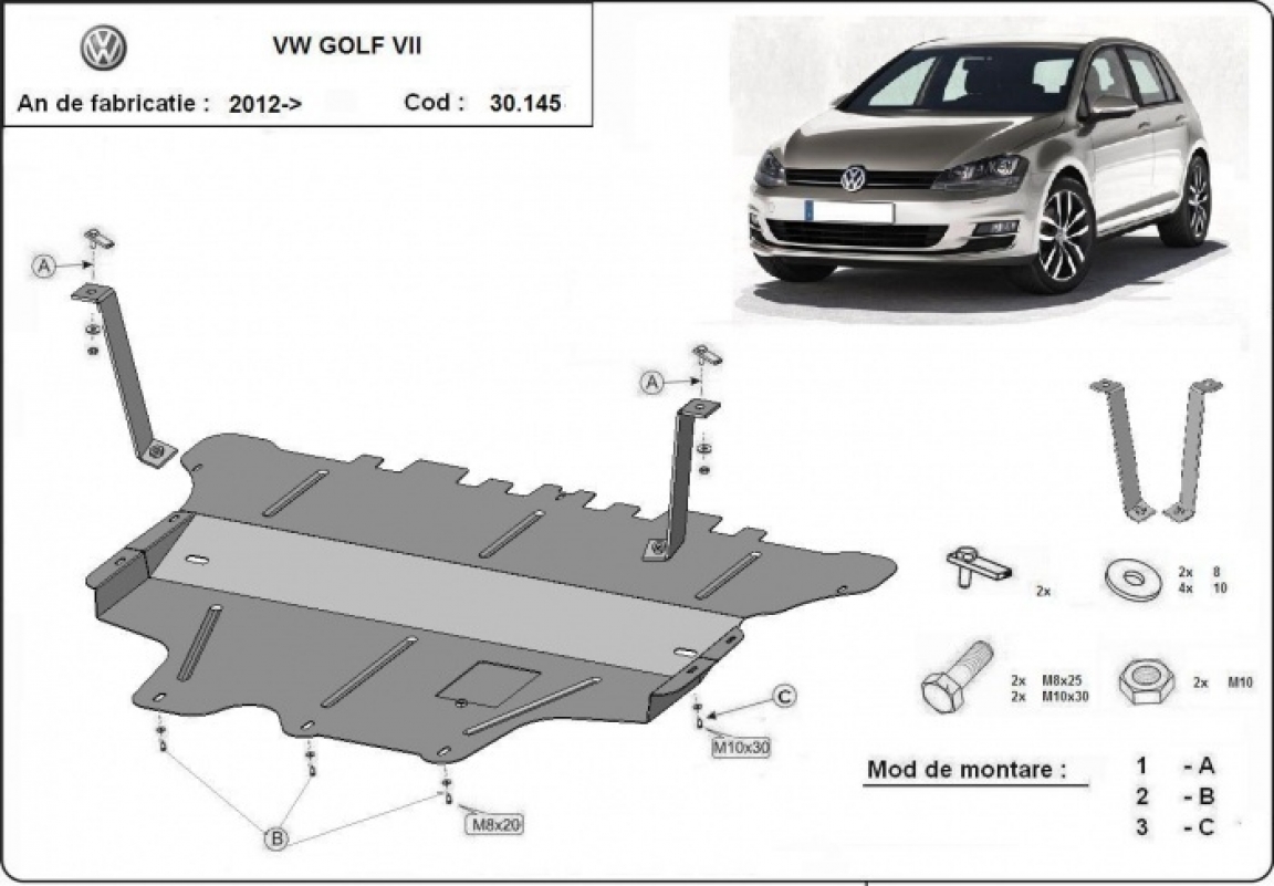 El cubre carter metalico es nuevo y se adapta perfectamente a todas las versiones de VW Golf 7 fabricadas entre 2012 y 2020. La placa protega los siguientes: motor, caja de cambios, radiador, parachoques delantero Está preparado de chapa de Acero de 2 mm. Cerrojos, calces y todos los accesorios incluidos. Todas las placas son estrachadas con pintura de polvo anticorrosivo. Las placas del protección del motor son equipados con braceares soldados para resistir mejor a los impactos exteriores. |