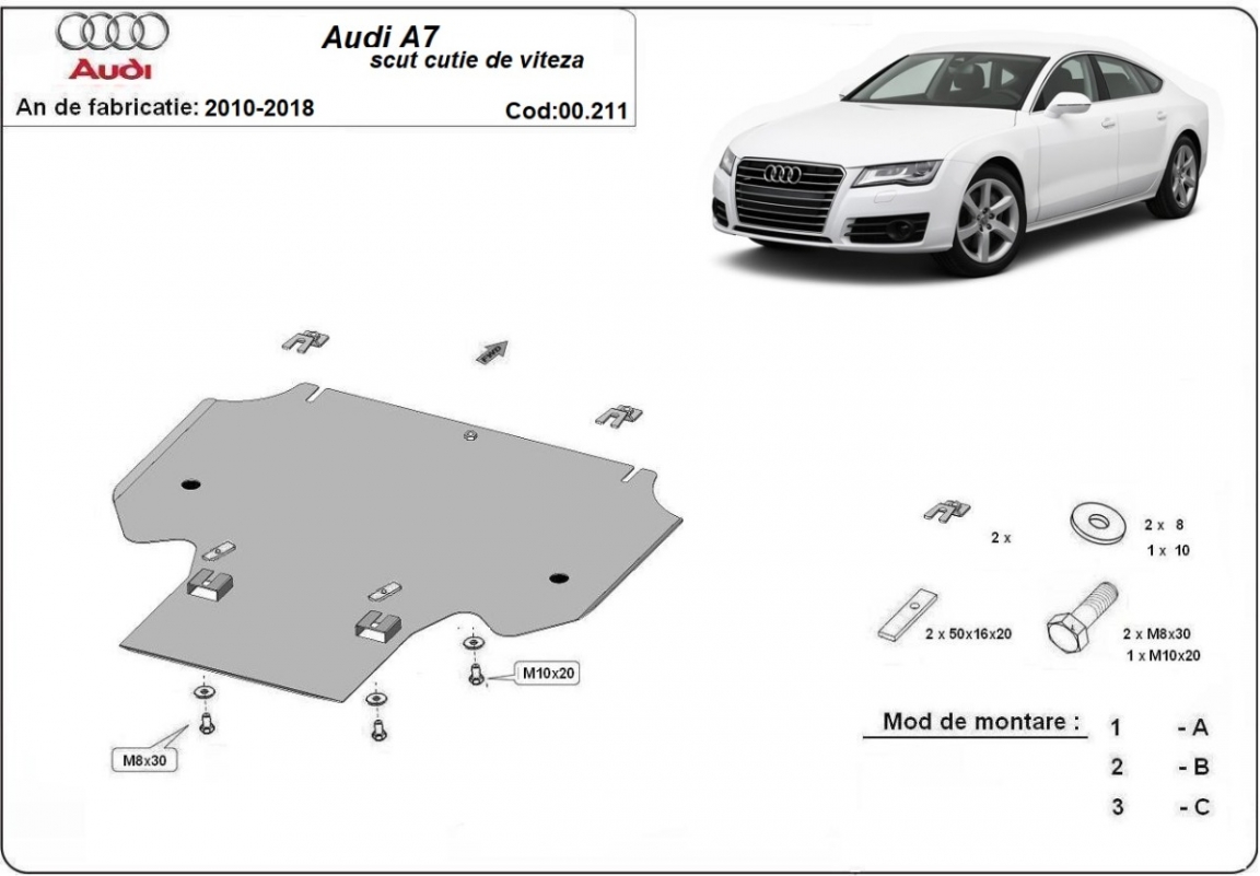 El cubre carter metalico es nuevo y se adapta perfectamente a todas las versiones de Audi A7 fabricadas entre 2011 y 2018. La placa protega los siguientes: caja de cambios Está preparado de chapa de Acero de 2 mm. Cerrojos, calces y todos los accesorios incluidos. Todas las placas son estrachadas con pintura de polvo anticorrosivo. Las placas del protección del motor son equipados con braceares soldados para resistir mejor a los impactos exteriores. |