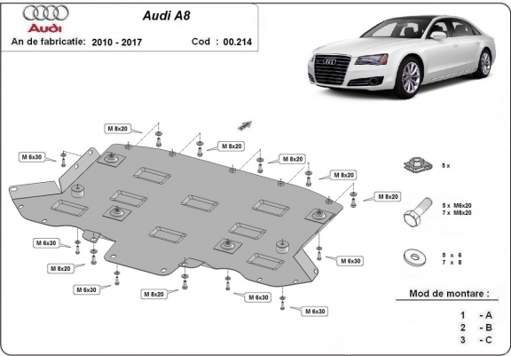 El cubre carter metalico es nuevo y se adapta perfectamente a todas las versiones de Audi A8 fabricadas entre 2010 y 2017. La placa protega los siguientes: caja de cambios Está preparado de chapa de Acero de 2 mm. Cerrojos, calces y todos los accesorios incluidos. Todas las placas son estrachadas con pintura de polvo anticorrosivo. Las placas del protección del motor son equipados con braceares soldados para resistir mejor a los impactos exteriores. |