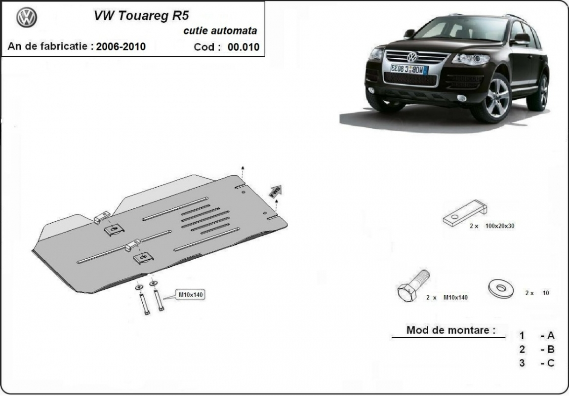 El cubre carter metalico es nuevo y se adapta perfectamente al Volkswagen Touareg R5 Automat, con las siguientes versiones de motor / accionamiento: Automat, fabricado entre 2003 y 2010. La placa protega los siguientes: caja de cambios Está preparado de chapa de Acero de 3 mm. Cerrojos, calces y todos los accesorios incluidos. Todas las placas son estrachadas con pintura de polvo anticorrosivo. Las placas del protección del motor son equipados con braceares soldados para resistir mejor a los impactos exteriores. |
