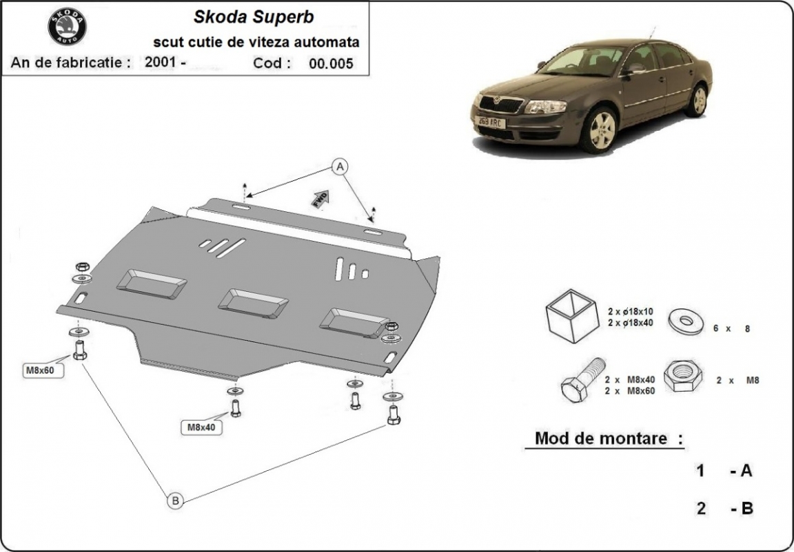 El cubre carter metalico es nuevo y se adapta perfectamente a todas las versiones de Skoda Superb - automatique fabricadas entre 2001 y 2008. La placa protega los siguientes: caja de cambios Está preparado de chapa de Acero de 2 mm. Cerrojos, calces y todos los accesorios incluidos. Todas las placas son estrachadas con pintura de polvo anticorrosivo. Las placas del protección del motor son equipados con braceares soldados para resistir mejor a los impactos exteriores. |