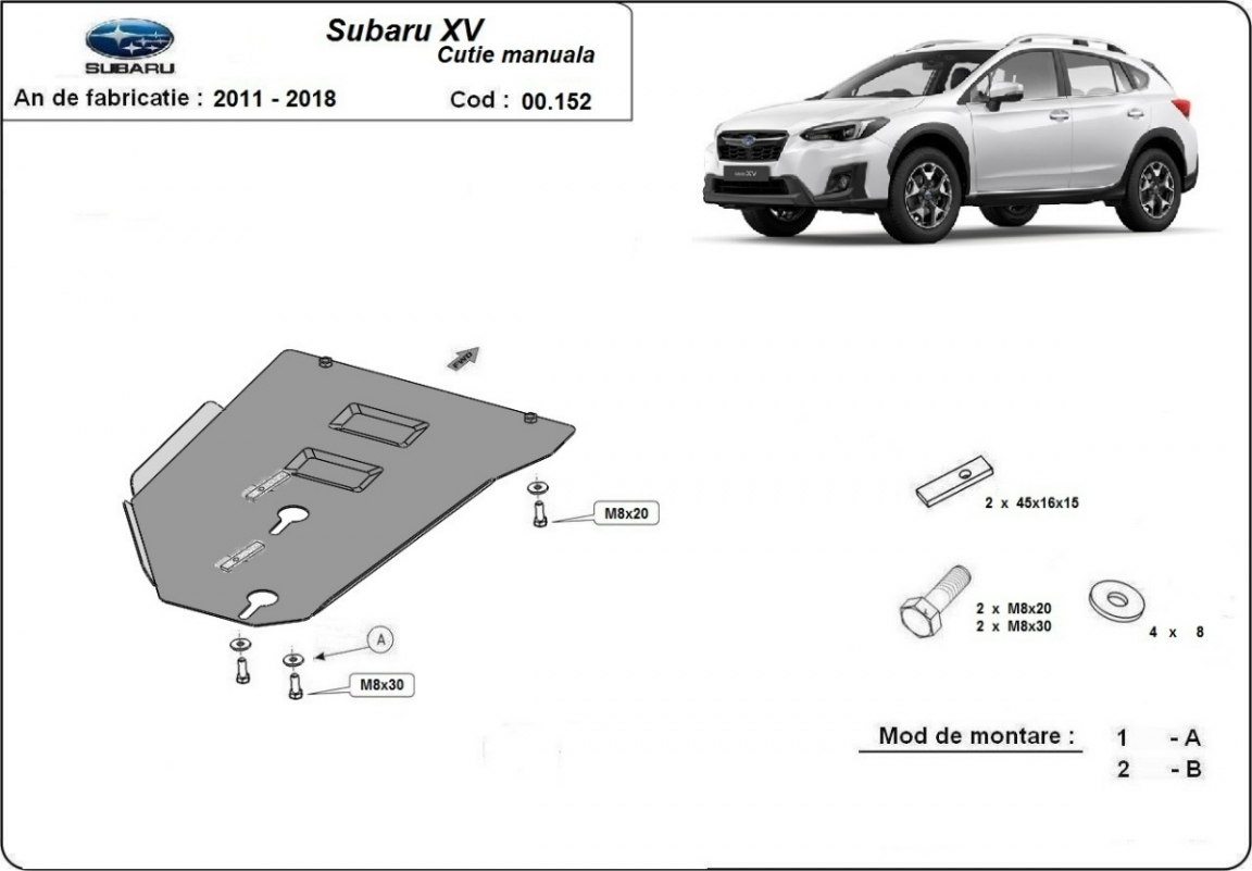 El cubre carter metalico es nuevo y se adapta perfectamente a todas las versiones de Subaru XV fabricadas entre 2011 y 2017. La placa protega los siguientes: caja de cambios Está preparado de chapa de Acero de 2 mm. Cerrojos, calces y todos los accesorios incluidos. Todas las placas son estrachadas con pintura de polvo anticorrosivo. Las placas del protección del motor son equipados con braceares soldados para resistir mejor a los impactos exteriores. |
